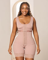 The adjustment system features three front hook-and-eye closure rows for progressive adaptation to your needs, complemented by adjustable shoulder straps that provide optimal support and a built-in bra for added security and comfort. The mid-thigh design, reinforced with silicone-edged lace at the bottom, ensures the garment stays in place without rolling up during your daily activities, while strategically placed boning provides lumbar support for enhanced comfort.