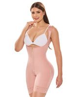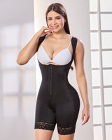 Its mid-thigh design with anti-slip silicone lace prevents the garment from rolling up or sliding out of place. It also features shoulder hooks for improved support, a front zipper, and a perineal zipper for maximum comfort throughout the day.
